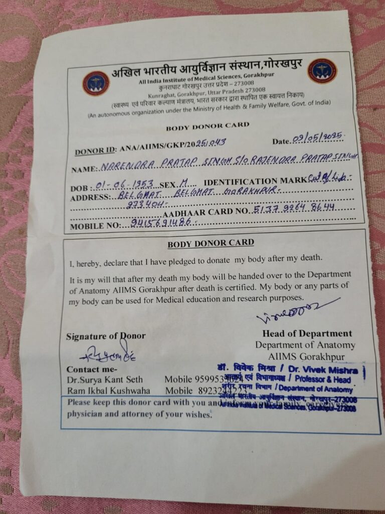 अब उन्होंने एक ऐतिहासिक और प्रेरणादायक कदम उठाया है — AIIMS, गोरखपुर में देहदान और अंगदान का संकल्प लेकर। यह कोई साधारण निर्णय नहीं है। यह एक ऐसा संकल्प है, जो मृत्यु के उपरांत भी जीवन देता है; जो विज्ञान को नई दिशा और पीड़ित मानवता को नई आशा देता है।