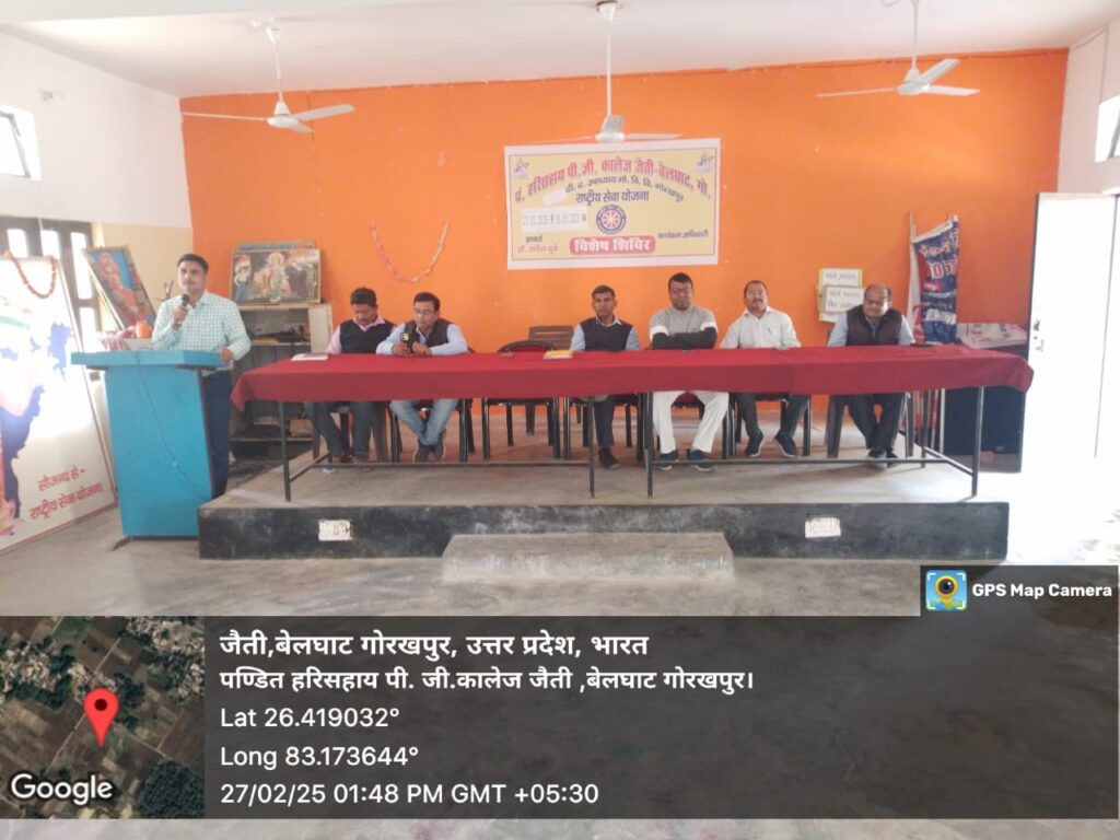 बेलघाट क्षेत्र स्थित पं. हरिसहाय पी.जी. कॉलेज, जैती, गोरखपुर में दिनांक 27 फरवरी 2025 से 5 मार्च 2025 तक संचालित होने वाले राष्ट्रीय सेवा योजना (NSS) सप्त दिवसीय शिविर का शुभारंभ हुआ। कार्यक्रम का प्रारंभ मां सरस्वती के चित्र पर माल्यार्पण, दीप प्रज्ज्वलन एवं पुष्पांजलि अर्पण के साथ किया गया। इसके पश्चात् ‘सर्वे भवंतु सुखिनः’ की प्रार्थना की गई।
