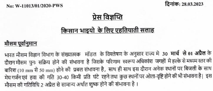 भारत मौसम विज्ञान विभाग के संख्यात्मक मॉडल के विश्लेषण के अनुसार राज्य मे 30 मार्च से 01 अप्रैल के दौरान मौसम पुनः सक्रिय होने की संभावना है जिसके परिणाम स्वरूप अधिकांश जगहों मे हल्के से मध्यम स्तर की बारिश (10mm से 50mm) होने की प्रबल संभावना है