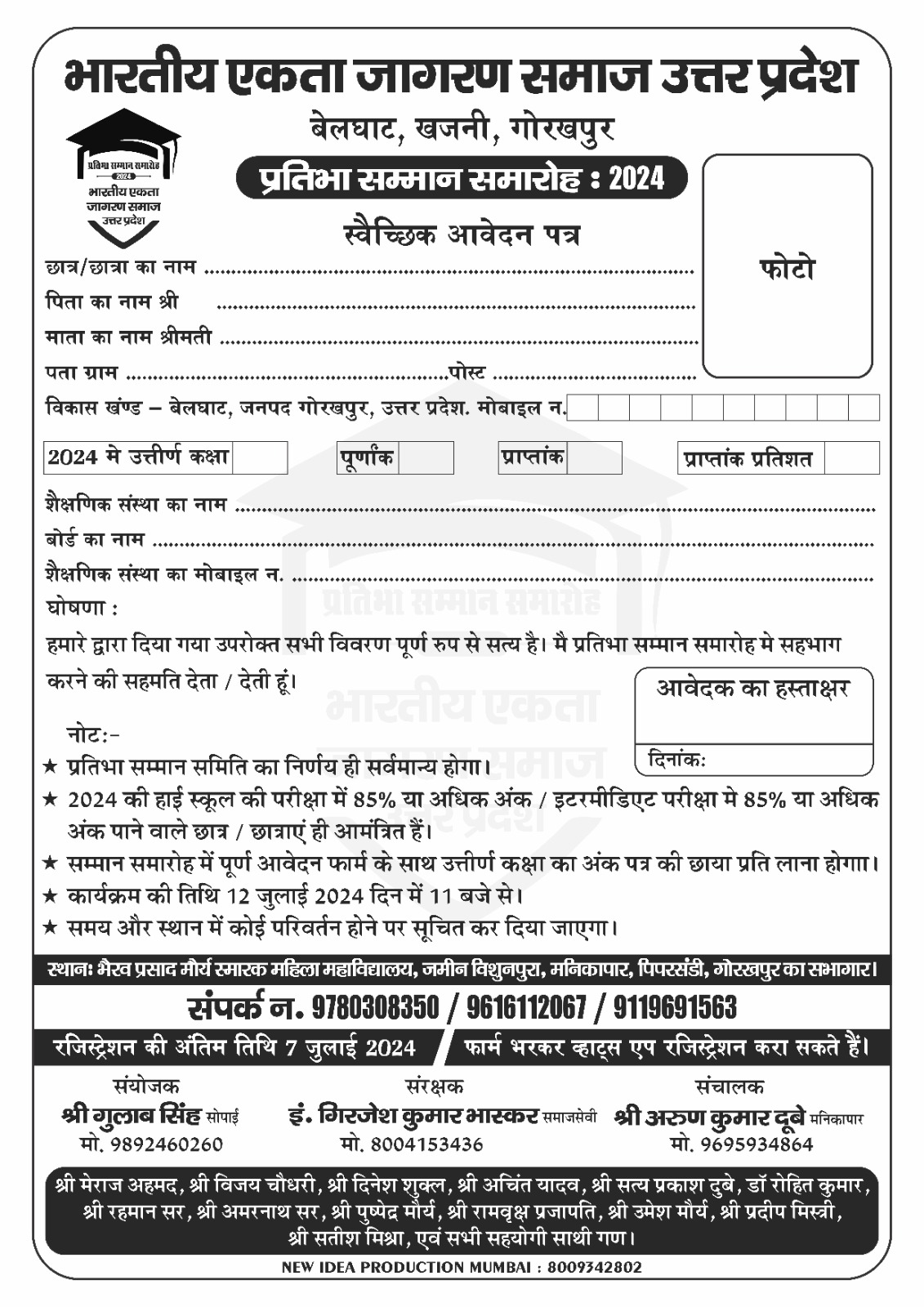 गोरखपुर, बेलघाट खजनी: भारतीय एकता जागरण समाज उत्तर प्रदेश के तत्वाधान में एक महत्वपूर्ण कार्यक्रम, “प्रतिभा सम्मान समारोह 2024”, का आयोजन किया जा रहा है। यह कार्यक्रम 12 जुलाई 2024, शुक्रवार को भैरव प्रसाद मौर्य स्मारक महिला महाविद्यालय, जमीन विशुनपुरा, मनिकापार, गोरखपुर के सभागार में आयोजित होगा। कार्यक्रम प्रातः 11 बजे से प्रारंभ होगा।
